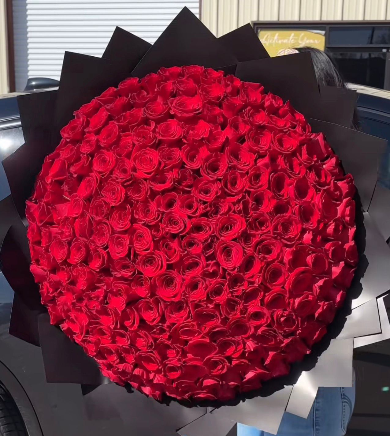 Buquê monumental com 200 rosas colombianas premium, conhecidas pelo tamanho superior dos botões, cores intensas e alta durabilidade. Um arranjo imponente e luxuoso, pensado para impressionar à primeira vista e transformar qualquer ocasião em um momento absolutamente inesquecível.