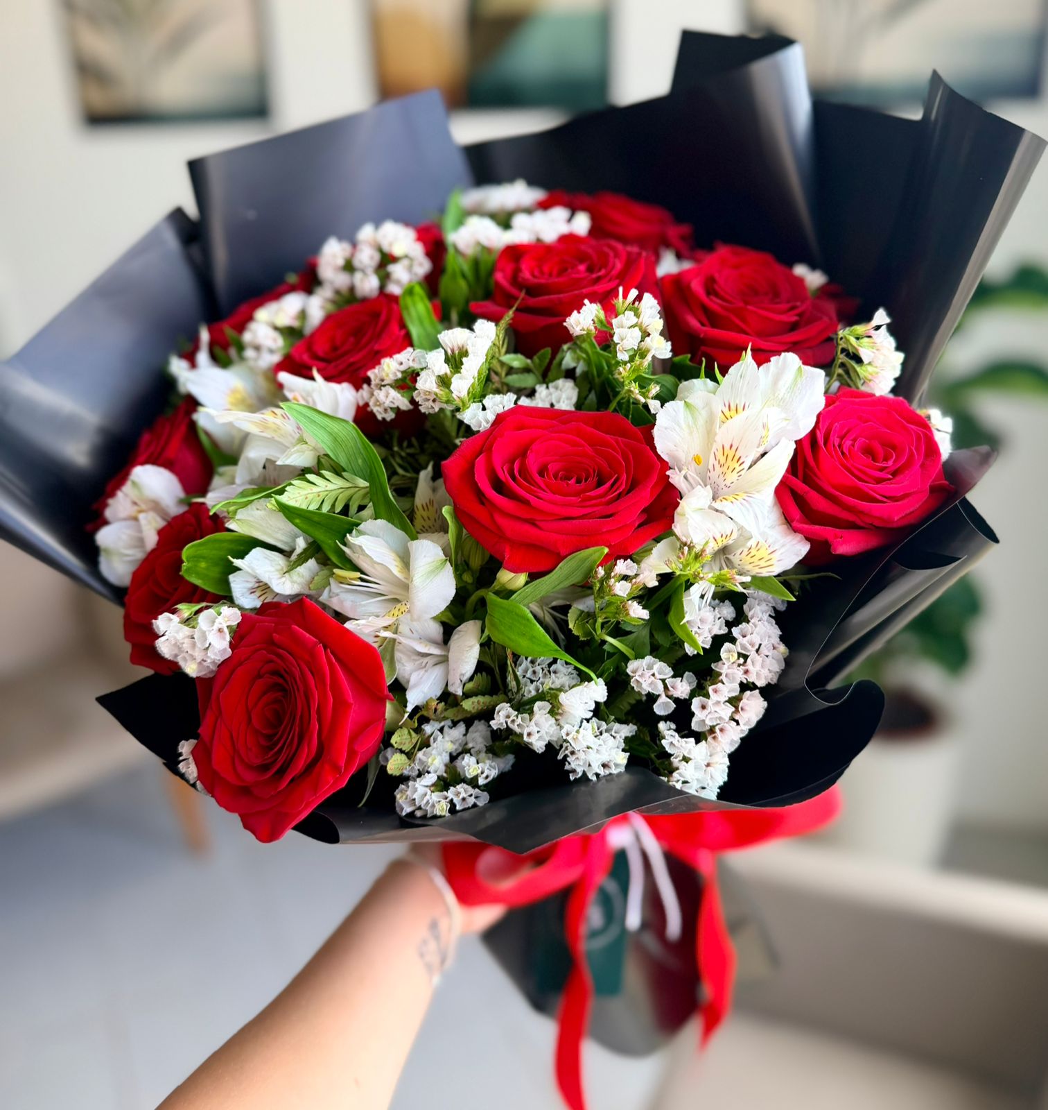 Uma dúzia de rosas colombianas com astromélias. Intensidade, elegância e presença em cada detalhe