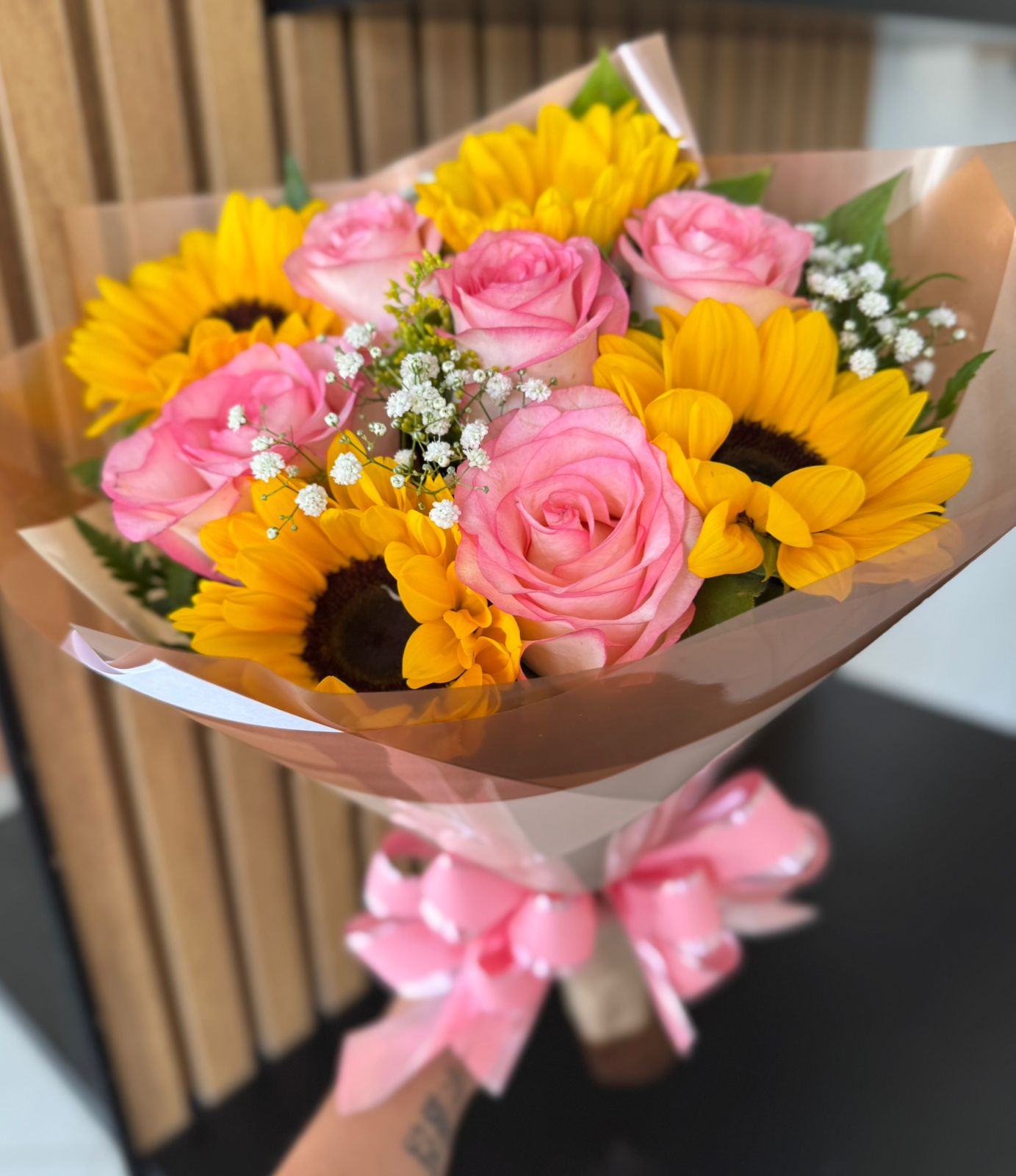 Um buquê que traduz alegria, carinho e leveza. A combinação perfeita entre a energia do girassol e a delicadeza das rosas cor de rosa para iluminar qualquer momento.