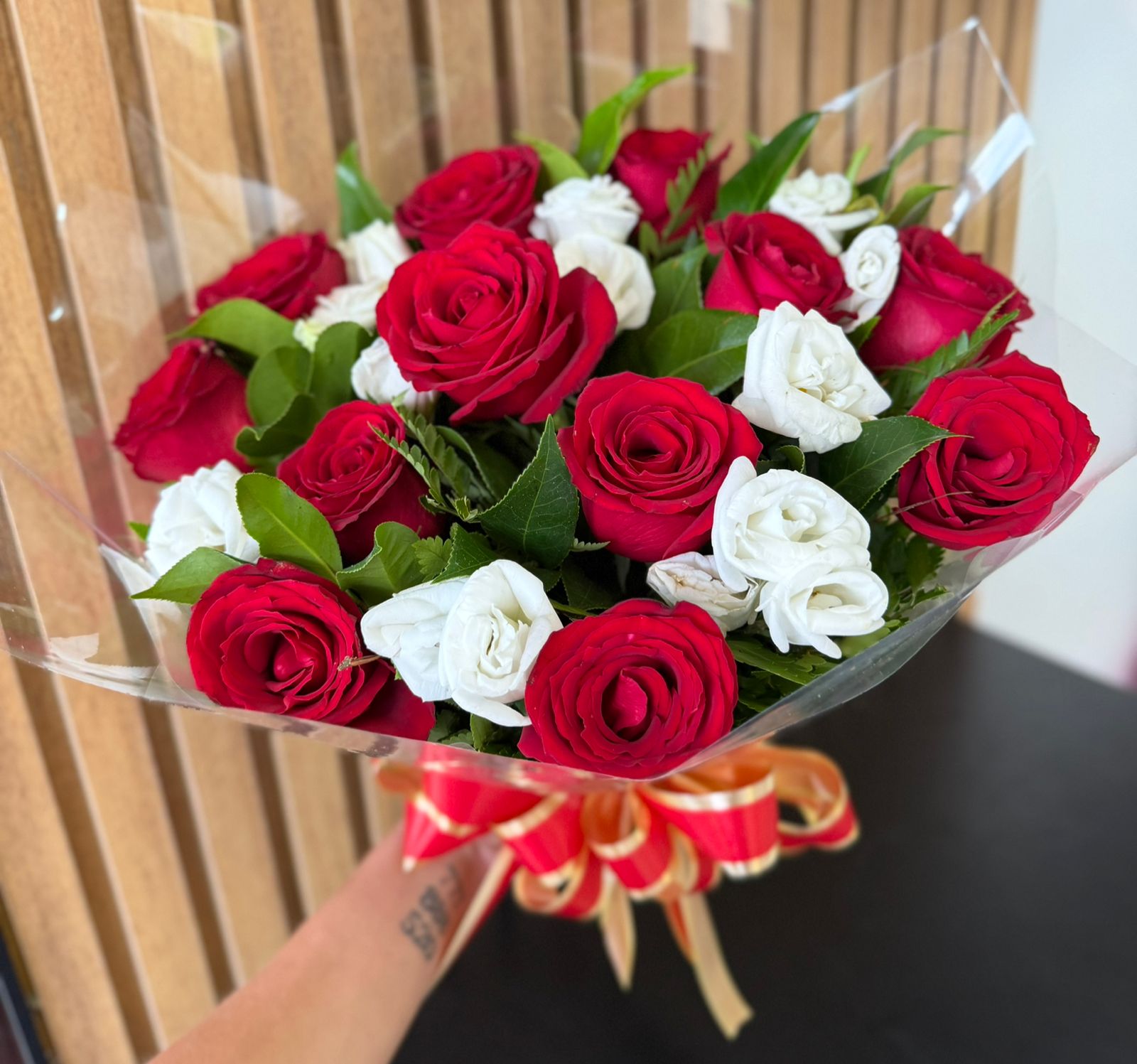 Um clássico que nunca sai de cena. 12 Rosas vermelhas e Lisianthus brancos em uma composição elegante, ideal para surpreender em qualquer ocasião.