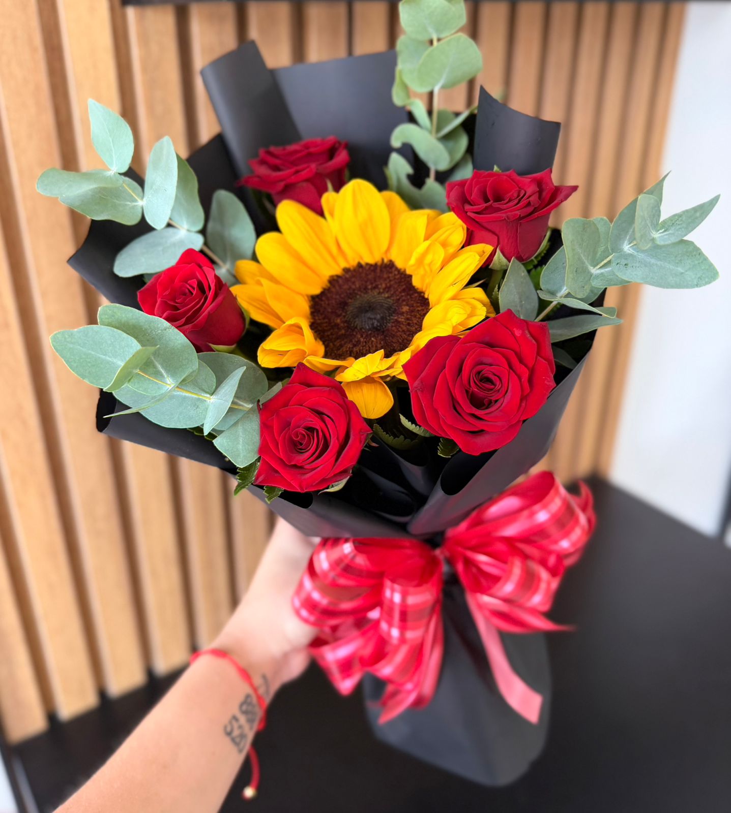 Com girassol, 5 rosas vermelhas e eucalipto, em embalagem premium, perfeito para surpreender com elegância e significado.