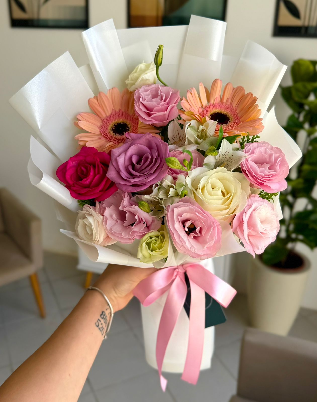 Surpreenda com um ramalhete médio que traduz carinho em cada detalhe: Rosas em tons suaves que representam amor e gratidão, gérberas que irradiam alegria e flores nobres que tornam o momento ainda mais especial.