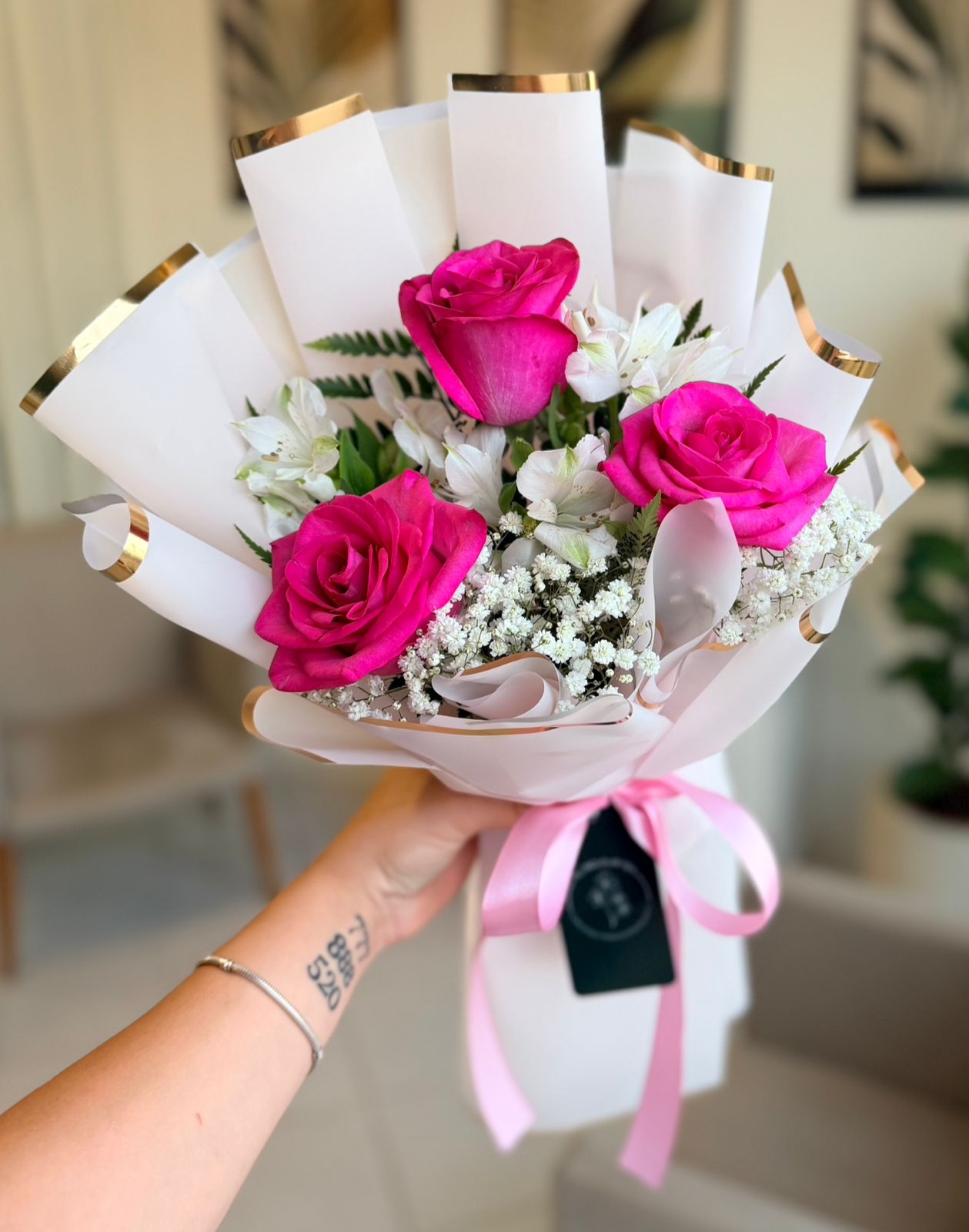 Buquê com três rosas cor de rosa e astromélias, harmonizadas na técnica coreana e finalizadas em embalagem premium. Delicado, moderno e perfeito para gestos cheios de significado.
