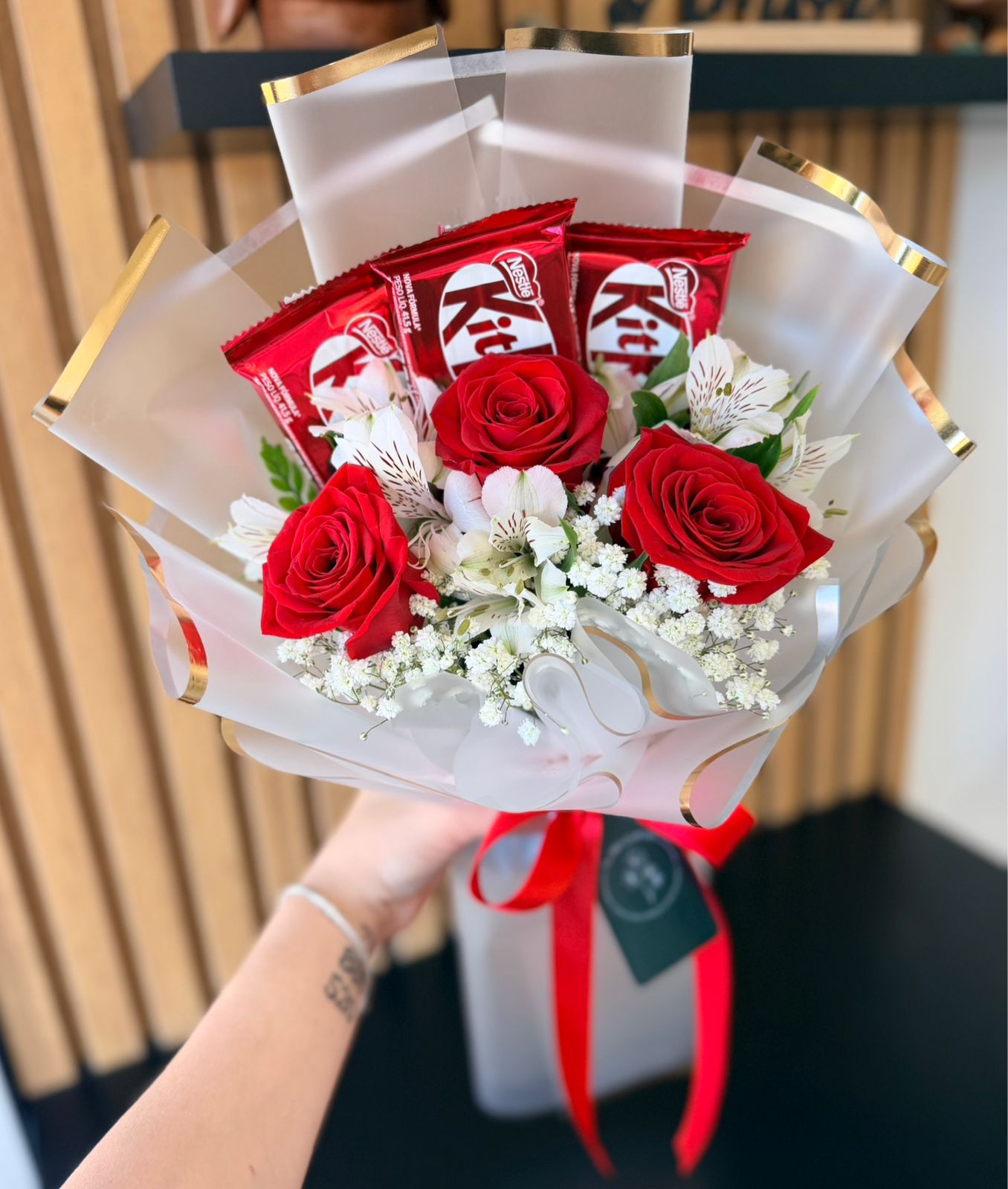 Buquê com rosas colombianas selecionadas, astromélias e chocolates, envolvido na técnica coreana.